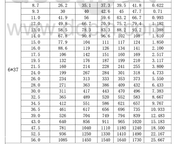 注:1、6*19和6*37的纖維芯重量系數(shù)分別為0.351和0.346,鋼芯都為0.400:2.