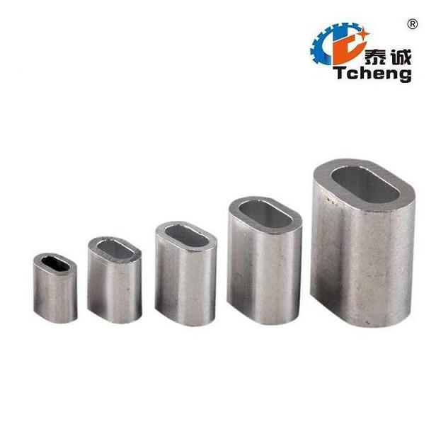鋼絲繩鋁套—鋁套是鋁材質(zhì)的,較輕,用來固定鋼絲繩兩端的頭的,鋼絲繩根據(jù)需要的掛圈大小,插入鋁套,然后放入壓套機模具內(nèi),(根據(jù)鋁套型號對應(yīng)壓套機模具,模具型號跟鋁套型號都是標(biāo)準(zhǔn)尺寸),壓制完,把兩邊擠壓出來的鋁廢料清理掉,一根鋼絲繩完成!