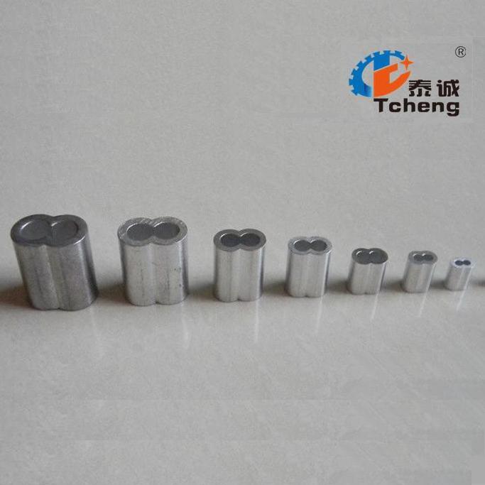 鋼絲繩鋁套—鋁套是鋁材質(zhì)的,較輕,用來固定鋼絲繩兩端的頭的,鋼絲繩根據(jù)需要的掛圈大小,插入鋁套,然后放入壓套機模具內(nèi),(根據(jù)鋁套型號對應(yīng)壓套機模具,模具型號跟鋁套型號都是標準尺寸),壓制完,把兩邊擠壓出來的鋁廢料清理掉,一根鋼絲繩完成!